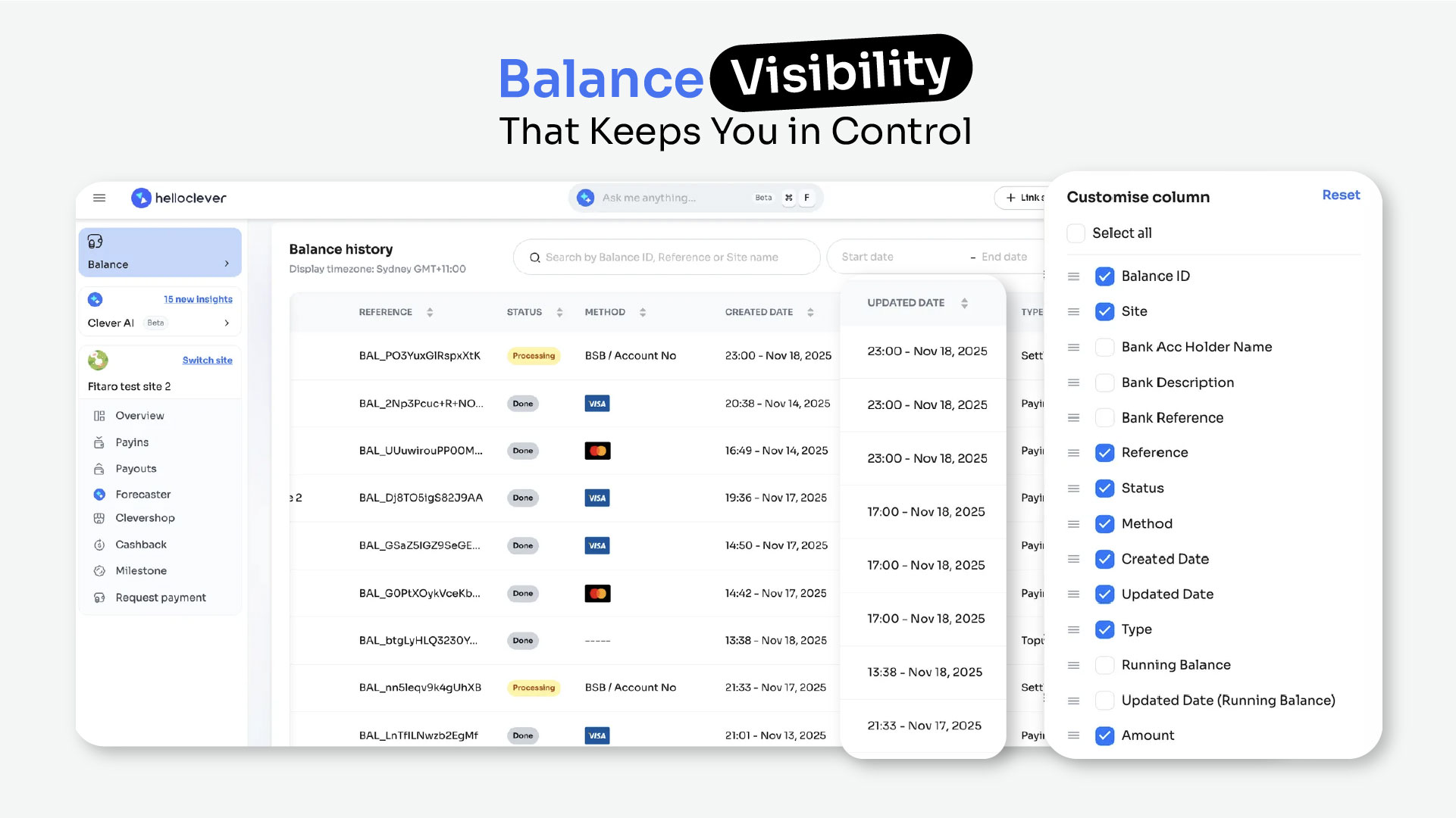 The new Running Balance fields show your available funds instantly, updated automatically for every Payin, Payout, or Settlement.